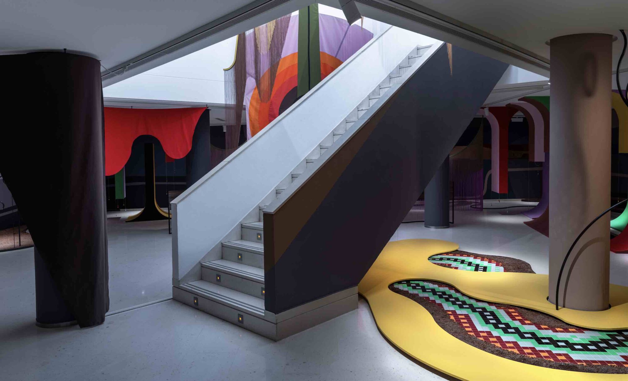 De hecho, la naturaleza desplegada en la sala 6 del IVAM se mueve entre esa parte inferior de la entrada, poblada de instalaciones muy coloristas, entre las que emerge una pieza con forma de serpiente mítica, y la parte superior conectada mediante la escalera que ejerce de umbral. “El pasado está en el interior de la tierra, de los anillos de los árboles, del cerebro”, explicó Canepa, mientras que el futuro, en cambio, estaba en la línea de horizonte del espacio superior, allí donde este “retrocede continuamente a medida que nos acercamos a él”.