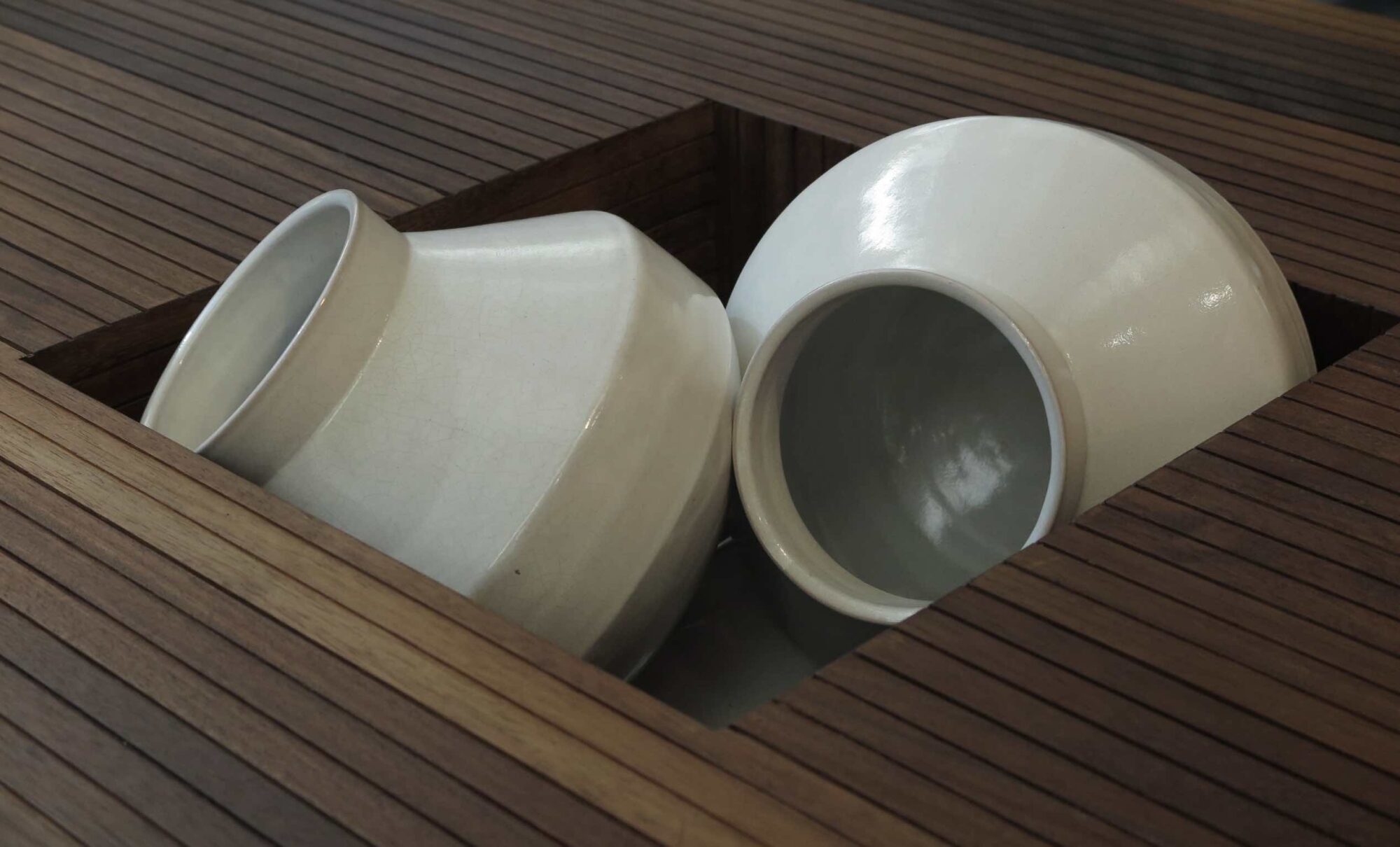 Con la concesión de un protagonismo indiscutible al material, la cerámica destaca entre la madera, ofreciendo el contraste de texturas y materiales que caracteriza al autor. La pieza es el hueco: “Hay un equilibrio, hay vacío”.