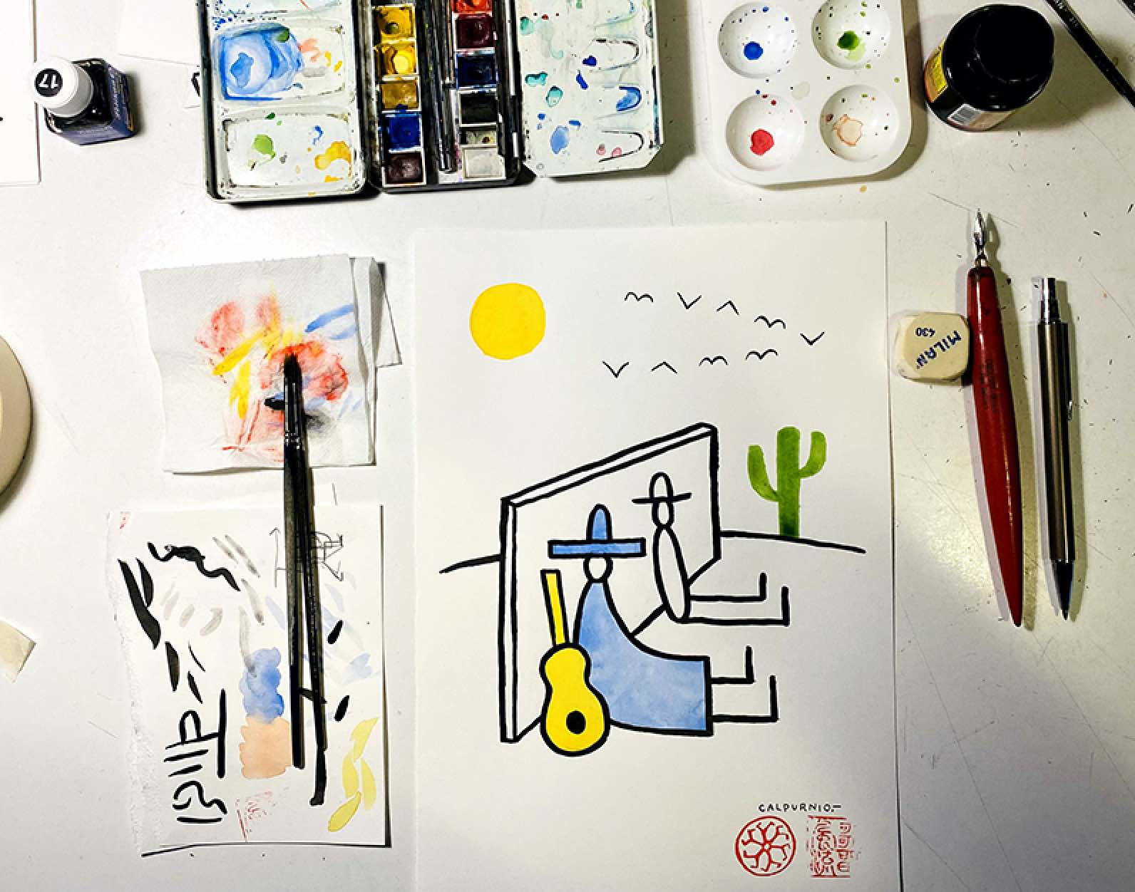 En su último trabajo, Calpurnio logró cambiar su estilo siendo, al mismo tiempo, fiel a sí mismo. Aparecen por aquí y por allá los pequeños monigotes que le caracterizan, que en esta ocasión están encarnados en la figura del maestro, pero la figura humana cede el terreno a la naturaleza. Pájaros, peces, árboles, las gotas de lluvia, el viento… son los protagonistas de su trabajo.