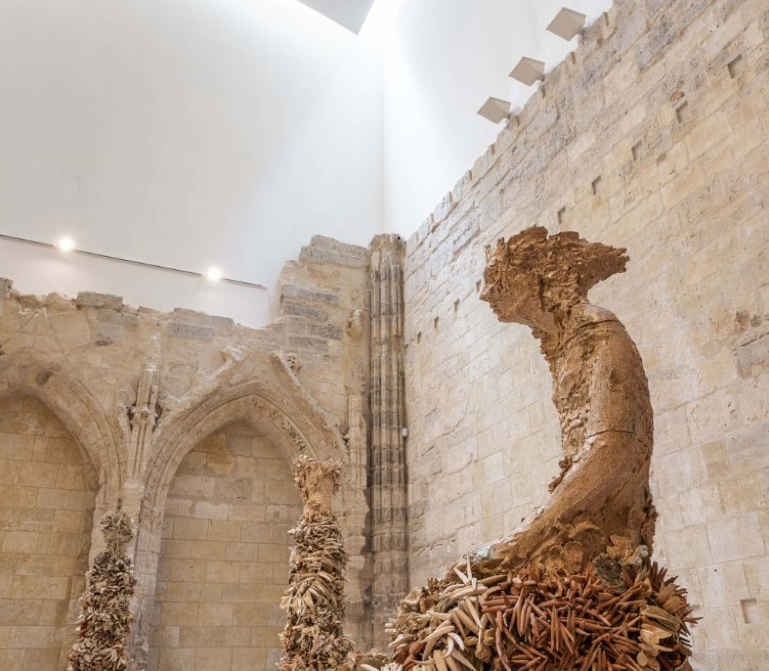 La sugestiva y sorprendente obra de la escultora italiana Chiara Camoni se presenta por primera vez en España de la mano del Museo Patio Herreriano de Valladolid. Bajo el título ‘Erguidas, yacentes’, la muestra monográfica permite ver una veintena de sus obras en dos salas contiguas. Una de ellas, la Capilla de los Condes de Fuensaldaña, el espacio más singular del museo.
