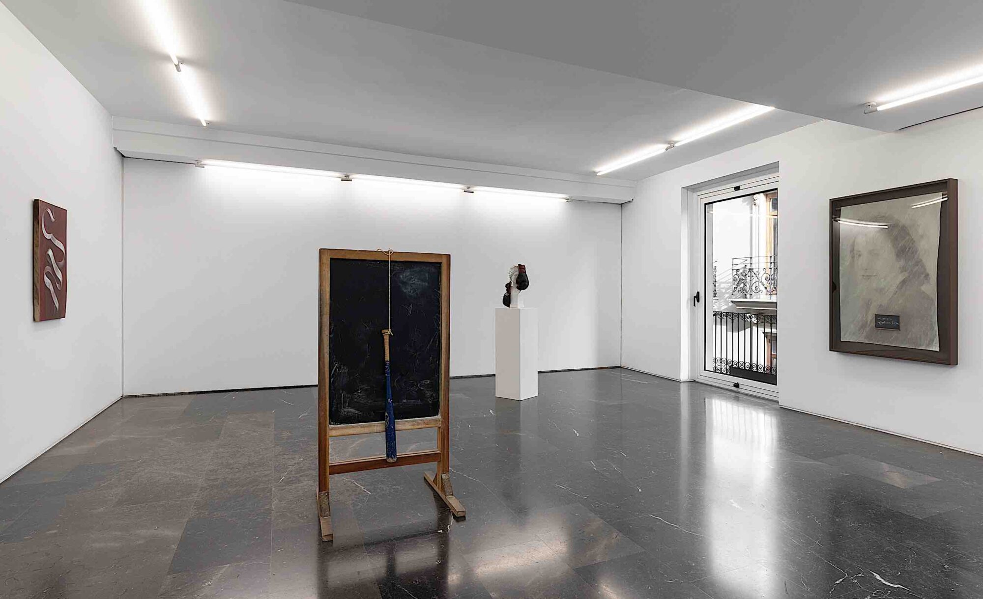 Carmen Calvo tiene otras dos piezas en la exposición que aluden a esa invisibilidad, en este caso, del miedo: miedo a la pizarra en negro asociado a un bate amenazador (‘El décimo día de cada mes’) e inquietud ligada a unos guantes de boxeo colgados sobre el rostro escultórico de una mujer en ‘Jack Johnson’, nombre del primer hombre negro en ser campeón mundial de los pesos pesados, en un tiempo en el que imperaba el más brutal de los racismos.