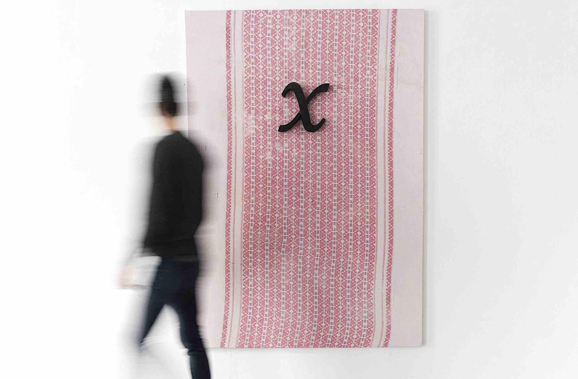 Y quién mejor que la propia Carmen Calvo para mostrar el camino por el que transita ese misterio. Con ‘Un algo tras la puerta’, la artista Premio Nacional de Artes Plásticas en 2013 nos coloca frente a una gran ‘X’ sobre un fondo alfombrado, jugando con la interrogación de la letra y lo textil que la soporta: texto y tejido.