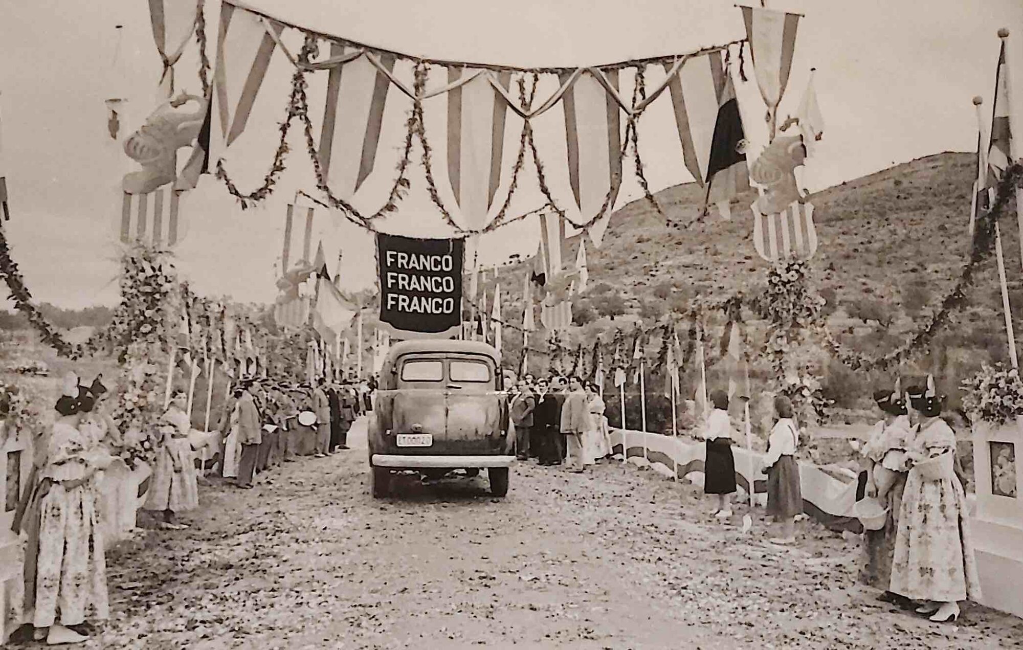“Los actos de propaganda y legitimación del régimen alcanzaban su máxima expresión durante las visitas de Franco y su familia, en las que toda la ciudad debía rendirles pleitesía. Recibimientos, homenajes y ceremonias se organizaban para escenificar un supuesto apoyo popular”, se dice en uno de los vinilos de la muestra que viene a resumir la hybris del poder franquista y de la que da excepcional cuenta el fotógrafo Luis Vidal Corella, auténtico cronista gráfico de la época.