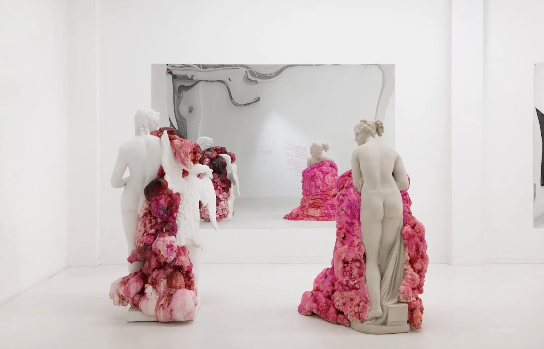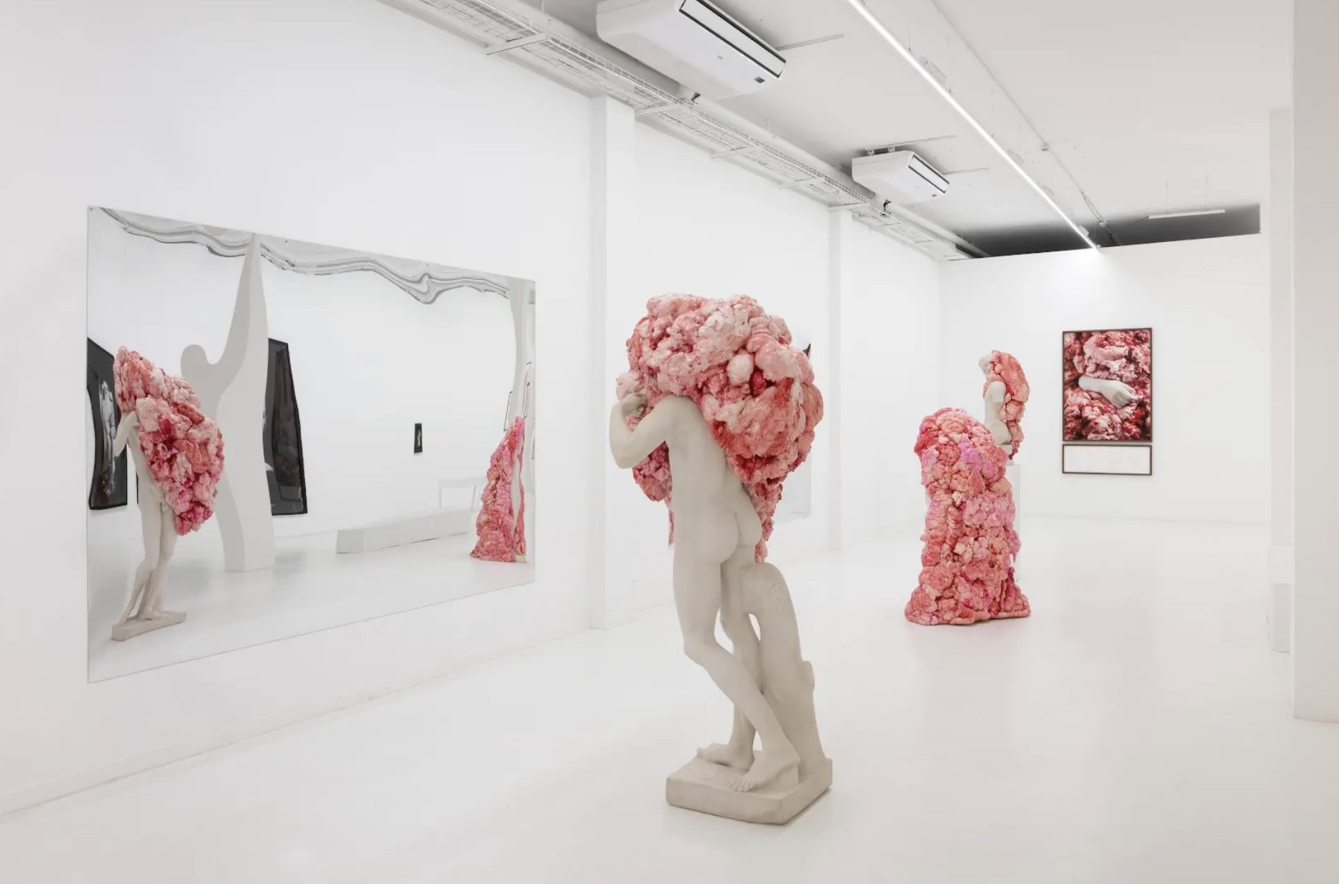 Al entrar en la sala situada al fondo de la galería, es primero necesario adaptar la mirada a un entorno completamente blanco. Poco a poco, se van identificando una serie de figuras de apariencia marmórea que parecen infectadas y de las cuales no sabemos si emergen secreciones o si, por el contrario, están siendo absorbidas.