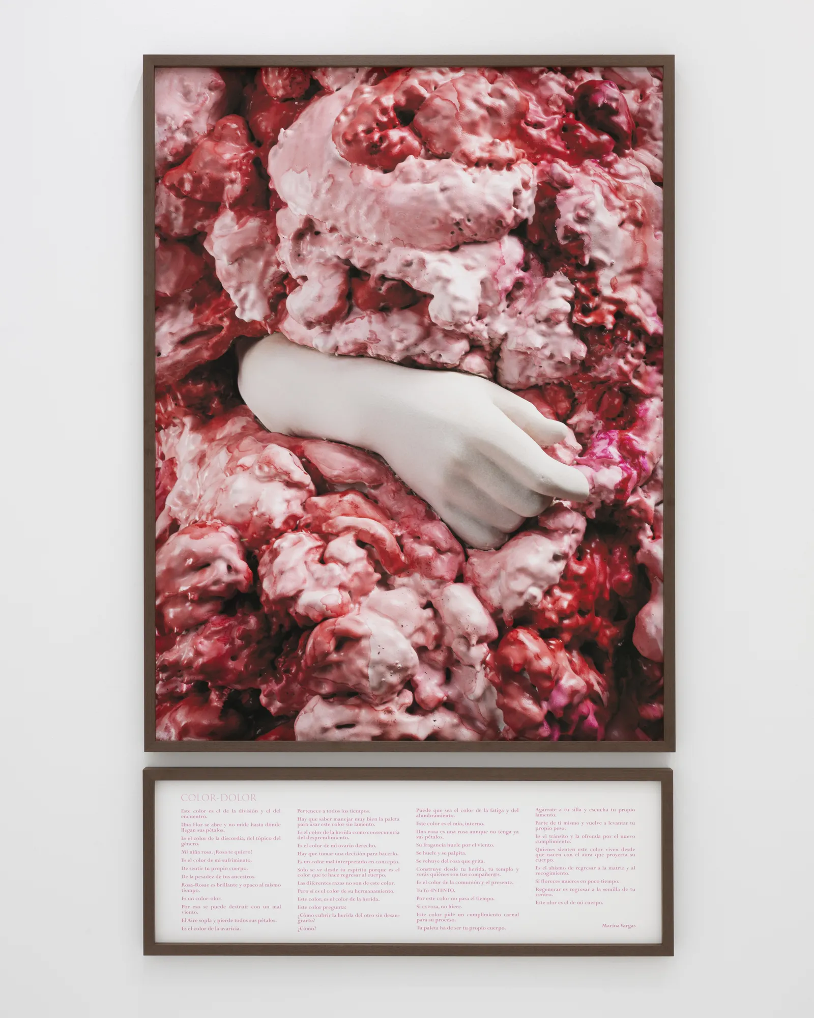 Asimismo, destaca ‘Dolor-Dolor’ (2026), una fotografía de gran formato que captura una de las manos que asoma entre el poliéster de una de sus esculturas. A esta imagen la acompaña un poema que la artista escribió durante su convalecencia, periodo en el que comenzó a investigar sobre su patología. Es ahí donde el color rosa se reveló como la antítesis del uso mercantilizado de este tono en los lazos contra el cáncer de mama.