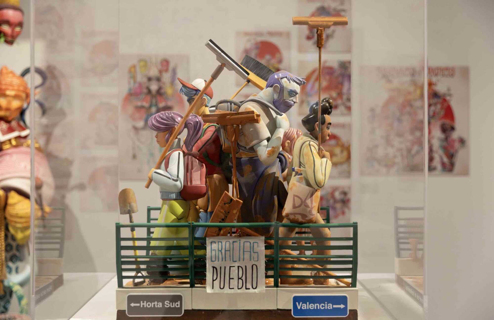Enfrente, resguardados en vitrinas, hay una selección de ninots infantiles tales como ‘Càpsula del temps’ (2019), para la falla Císcar-Burriana; ‘Que no caiga en l’oblit’ (2024), para la comisión Duque de Gaeta-Pobla de Farnals; y ‘Puente de la Solidaridad’ (2025), para la falla del Pilar. Estos trabajos dan paso a una sección con bocetos de la hoguera ganadora de 2025, ‘Vanity’, realizada por Paco Torres con el diseño de Camallonga.