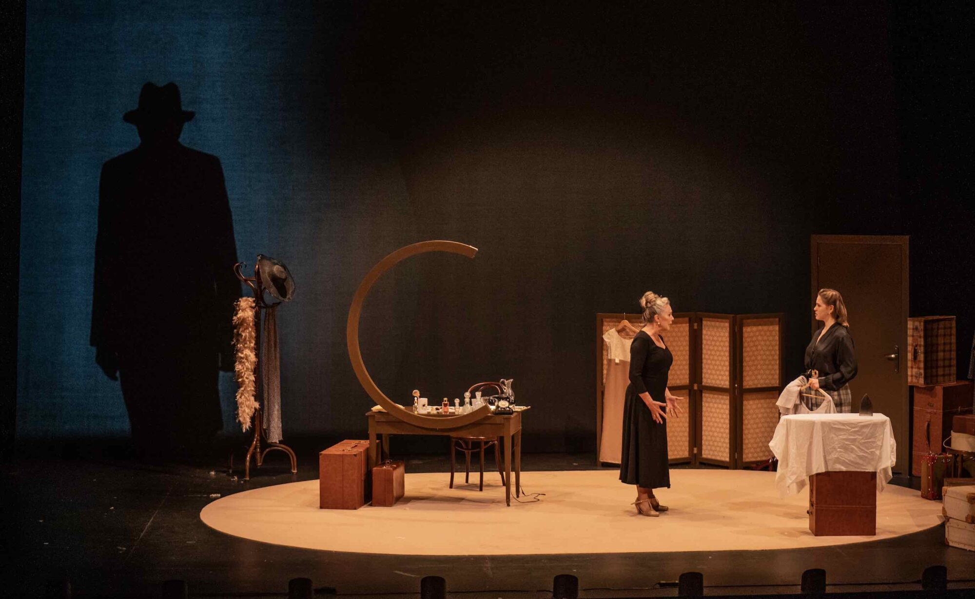 La escenografía es sobria, etérea, ocupada solo por lo imprescindible: “Un camerino que es y no es camerino. Un espacio mental donde confluyen todos los tiempos de una vida. Las sombras que visitan a Catalina no son fantasmas literales: son presencias que habitan su memoria, voces que la sostienen o la confrontan”, señaló Román Calleja, director de la obra.