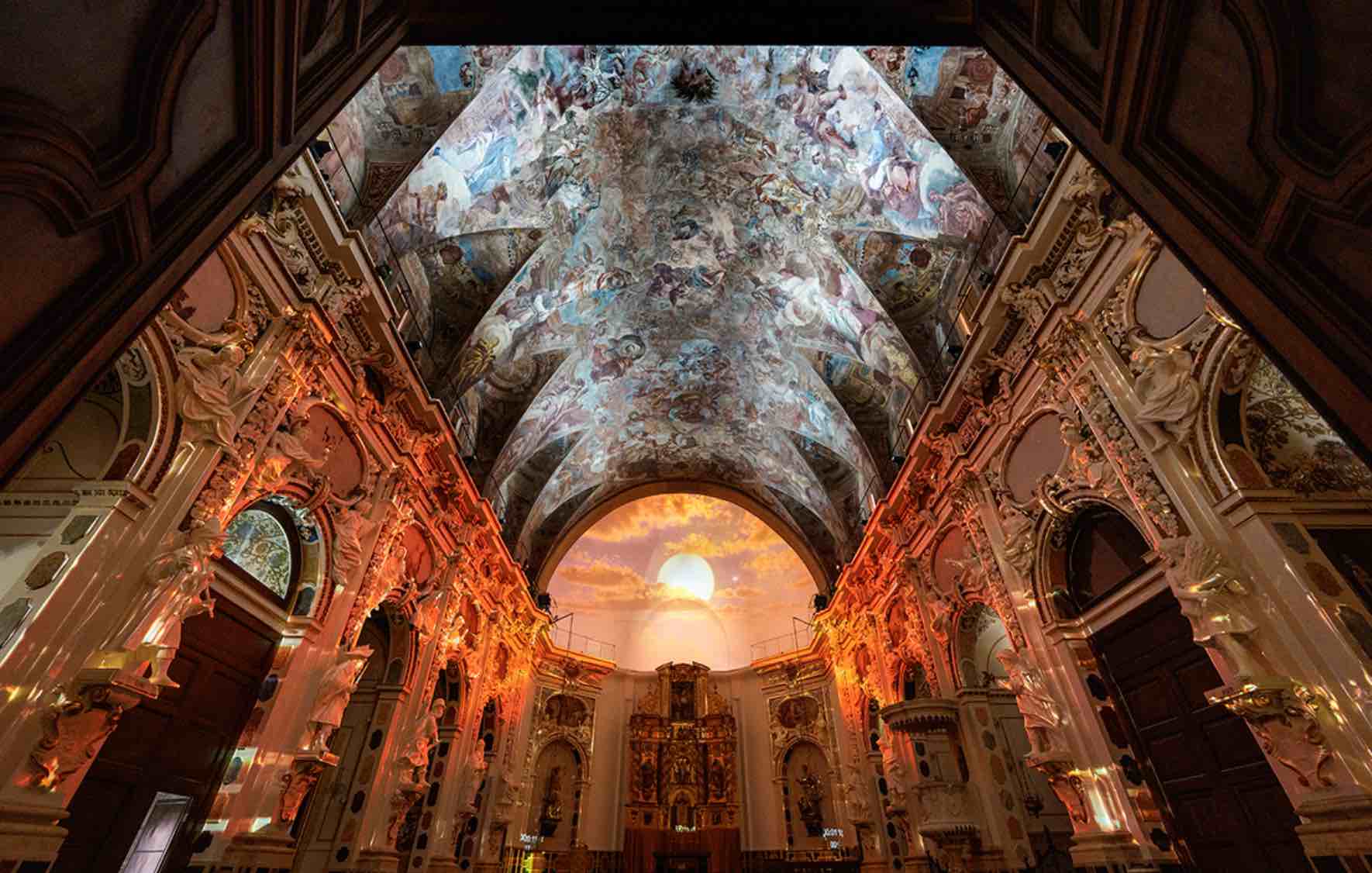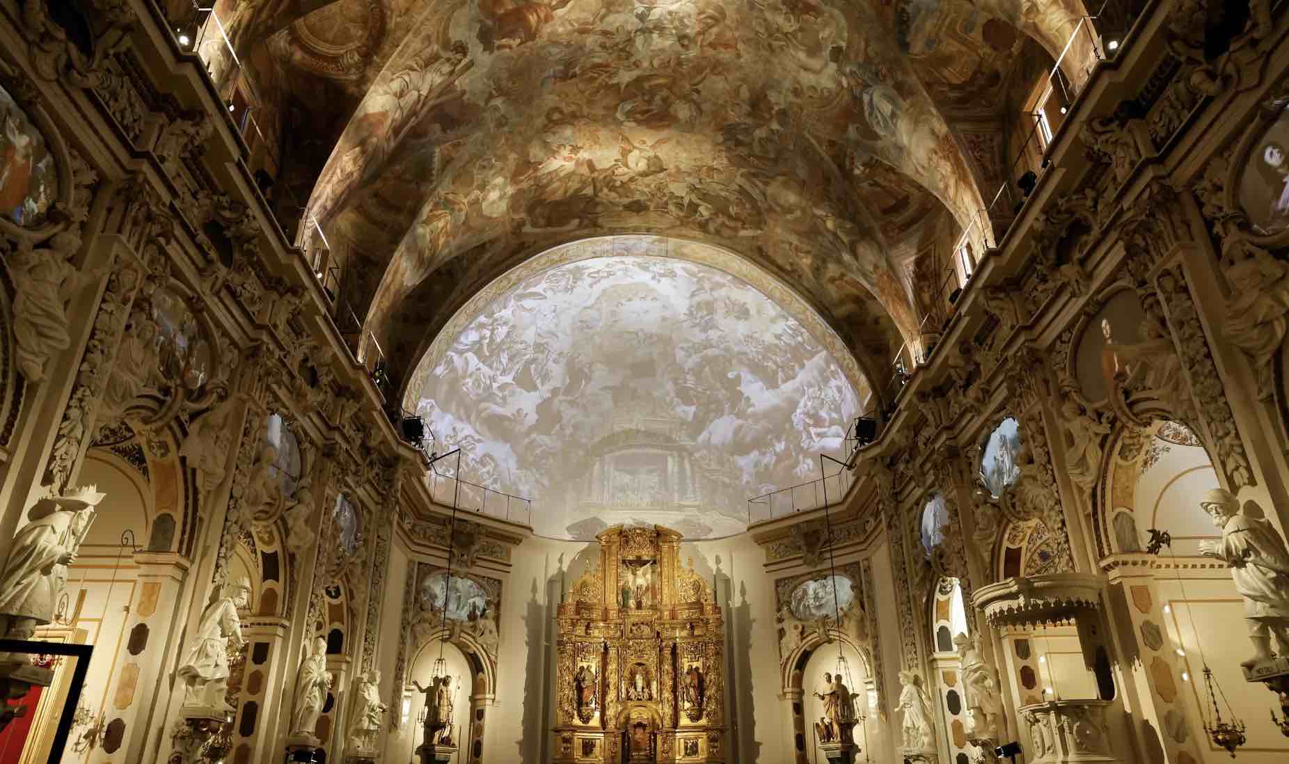 De esta forma, sobresale el tratamiento digital del ábside a través de la proyección de tres fotografías testigos del paso del tiempo. La primera corresponde con la fotografía tomada antes del incendio del 36, en la que se muestran las pinturas del ábside en su mayor esplendor; la segunda se trata de una imagen tomada después del incendio donde las pinturas aparecen ennegrecidas y la iconografía se desvanece; la última imagen corresponde con el resultado de la restauración con la verdadera paleta de colores utilizada por Palomino.